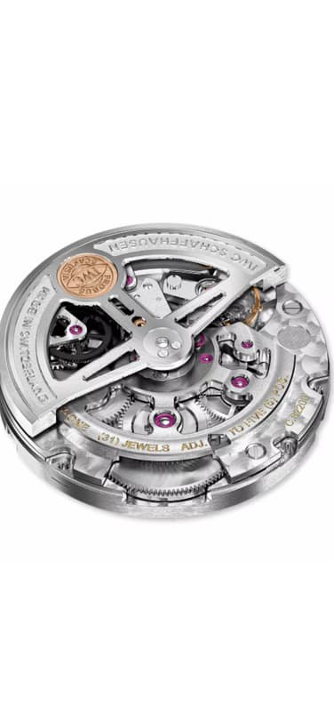 IWC万国表自制82000机芯秉承IWC万国表优质自动机芯传统。它配有IWC万国表高效比勒顿自动上链系统,可以通过转子在两个方向上为主游丝上链。与IWC万国表52000机芯系列一样,系统中受到明显压力的组件,比如棘爪、自动齿轮或凸轮,完全以无磨损陶瓷打造。使用这种高科技材料,这些组件几乎不会出现磨损。高效的自动上链系统为主游丝提供至少60小时的动力储备。配有扁平线圈的无微调计摆轮振频为4赫兹(28,800次/小时),确保高精准度。转子为镂空结构,装饰珠形纹饰和日内瓦条纹的机芯一览无余。