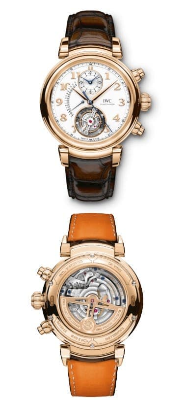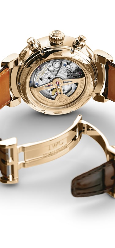 18K 红金款达文西陀飞轮逆跳计时腕表(型号:IW393101)的飞行陀飞轮令整款腕表脱颖而出,让人过目不忘。复杂功能陀飞轮的框架被移至腕表下方,由此省略了上方桥板。此外,这款时计还搭载极富高科技内涵的陀飞轮掣停功能,借此可对腕表进行精确至秒的设定。