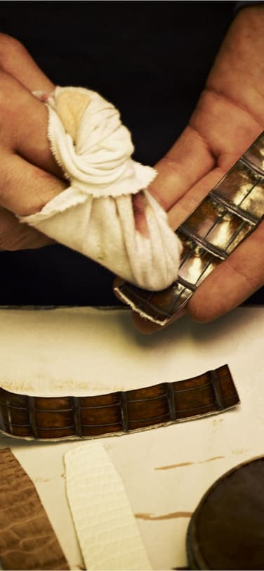 历史最悠久的三个工厂车间均用于制作男装皮革产品。地窖里储存着优质皮革:英国母牛皮、美国马皮以及鳄鱼皮、蜥蜴皮和蟾蜍皮等异国皮革,甚至还有鳗鱼皮。因此,将面料剪裁成形需要灵巧的手指和熟练的技艺,否则一次错误就可能使珍贵的材料报废。剪裁工按照卡纸模板剪切皮革,用于制作手工缝制的鞋款。每一厘米的皮革都绝不浪费。