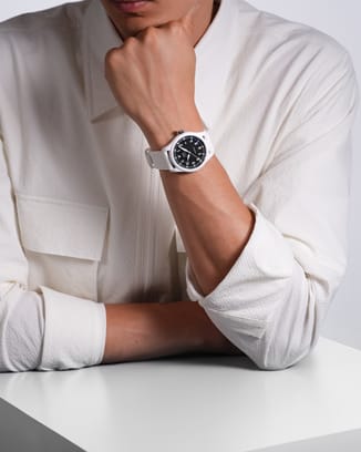 白色陶瓷表壳搭配黑色表盘,印有白色分钟刻度,数字, 时标和黑色指针涂覆Super-LumiNova®夜光涂层,形成鲜明对比,确保清晰读时。