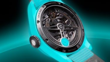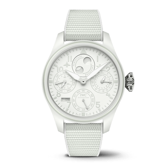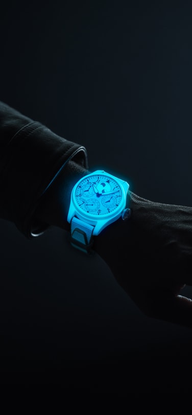 这款大型飞行员Ceralume®夜光瓷万年历腕表呈现两种截然不同的视觉效果。在日光下,它以层次丰富的白灰配色以及亮面与哑光交织的质感尽显魅力。在暗处,腕表则会完全转变色泽,散发蓝色光亮,持续数小时。