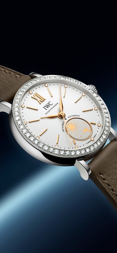 太阳和月亮于表盘呈现日夜更迭的永恒之舞:这款柏涛菲诺系列昼夜显示自动腕表34,是首款搭载昼夜显示功能的34毫米柏涛菲诺系列腕表。6时位置的昼夜显示小表盘指示当前是白天还是夜晚。每至正午或午夜时分,太阳或月亮将旋转于显示盘的上方区域。这款女士腕表采用精钢表壳、镀银表盘、镀金指针和镶贴时标。表壳和表盘镶嵌总重0.99克拉的66颗钻石,得益于升级的镶嵌工艺,钻石折射出更璀璨的光芒。灰褐色小牛皮表带经植物鞣制处理,质感自然柔软,搭配蝴蝶式折叠表扣,尽显现代奢华感。表带搭载快速更换系统,可以轻松更换表带。