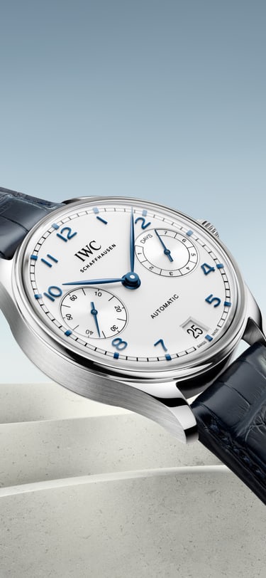 这款葡萄牙系列自动腕表42配备精钢表壳、银月白表盘、蓝色指针和时标、蓝色鳄鱼皮表带。